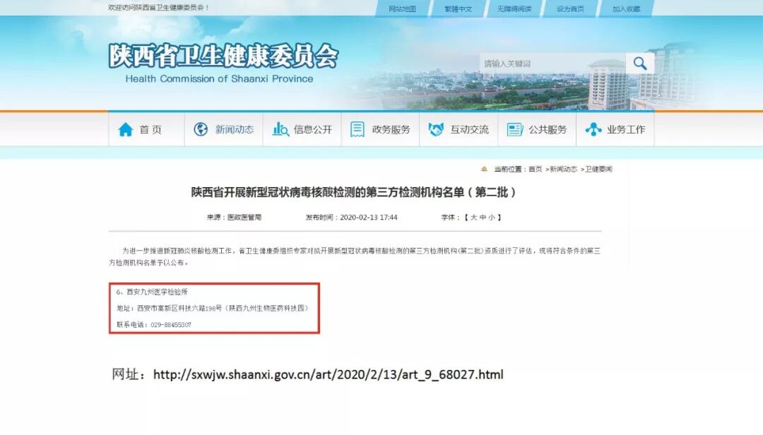 推荐新闻 西安九州医学检验所已被认定为陕西省第二批“新冠”病毒核酸检测第三方检测机构为进一步推进新冠肺炎核酸检测工作,陕西省卫生健康组织专家已对第二批拟开展新型冠状病毒核酸检测的第三方检测机构资质进行了评估。我公司作为符合条件的医疗机构现已被认定为第二批“新冠”病毒核酸检测第三方检测机构。